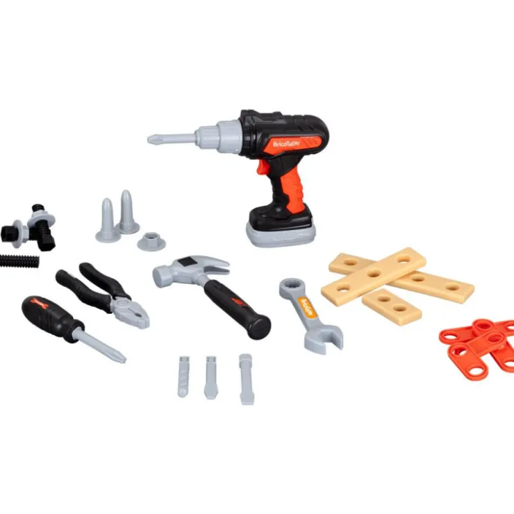 Bolsa de tela resistente para transportar y guardar todas las herramientas que incluye, con un asa práctica para colgar. El set cuenta con un taladro eléctrico con puntas intercambiables, martillo, destornillador, alicates, llave inglesa, tuercas y muchos más accesorios. Favorece la habilidad manual, estimula la imaginación y potencia el desarrollo del lenguaje mientras se convierten en auténticos profesionales del bricolaje.