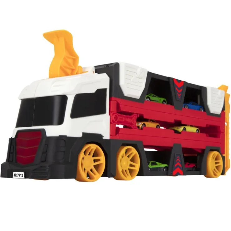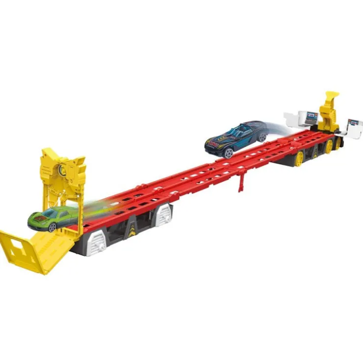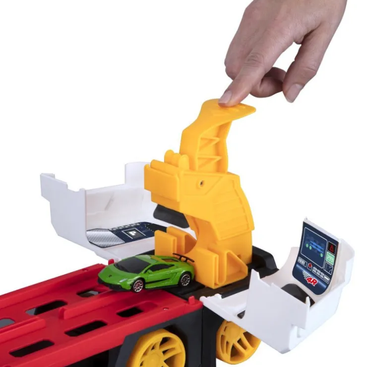 Un camión portacoches que se convierte en una pista de más de 150 cm. Activa el lanzador doble de la cabina y los coches alcanzarán velocidades de vértigo hasta llegar a la meta, el primero que llegue activará los sonidos y aplausos. Levanta las diferentes rampas de la pista para añadir más emoción. Puede almacenar hasta 12 coches (se venden por separado). Incluye 2 coches y además tiene un asa para que lo puedas llevar a cualquier parte. Sonidos y aplausos. Rueda libre.