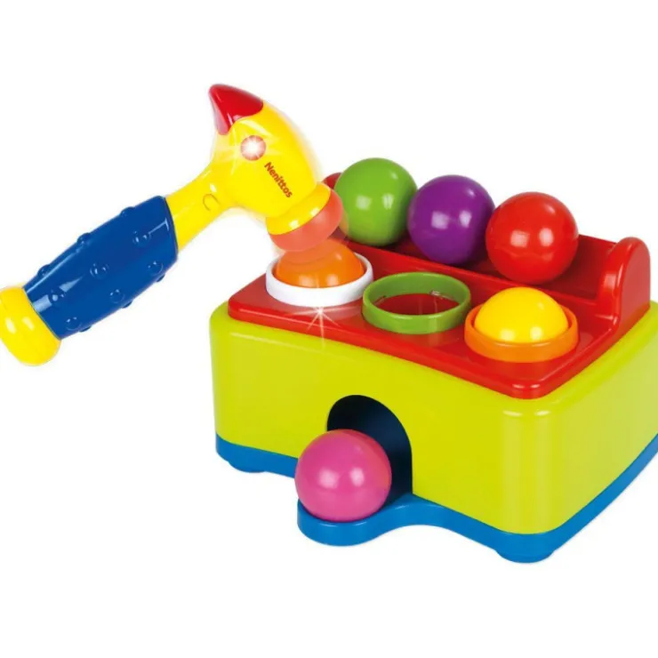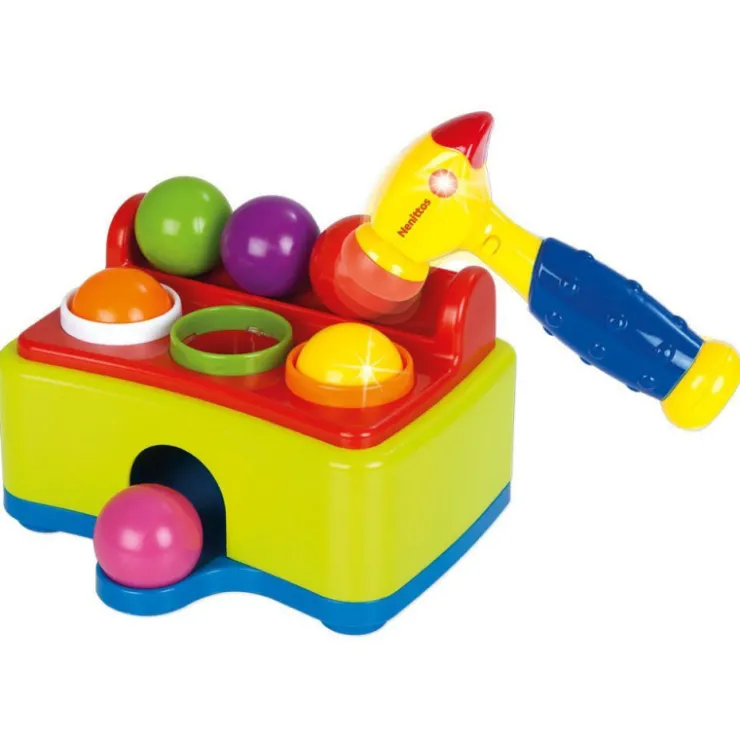 Utilizando el martillo para golpear las bolas de colores, tu bebé escuchará sonidos divertidos a la vez que ejercita la coordinación ojo-mano además de segmentar los movimientos de los dedos.