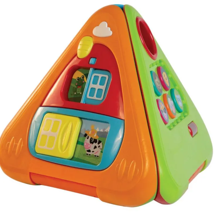 En las caras desplegables hay 5 botones con sonidos de animales, un rodillo y un botón giratorio con bolitas sonajeros, engranajes de cadena, botones texturizados, 2 ventanas para abrir/cerrar, un camino serpenteante para seguir y otros 6 botones con luces, sonidos y melodías. Abierta tiene en la parte central un encajable con 4 piezas geométricas. Para transportarla tiene en la parte superior orificios circulares y cierre magnético.