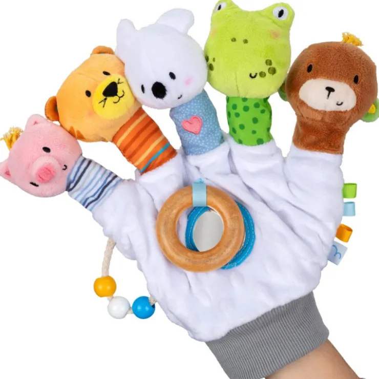 Acolchado, interior forrado y puño elástico. El bebé seguirá el movimiento de tus dedos, hazlos aparecer de pronto y despertarás su entusiasmo. Con dedos-marioneta para inventar cuentos, mordedor, espejito irrompible y cordón con bolitas.