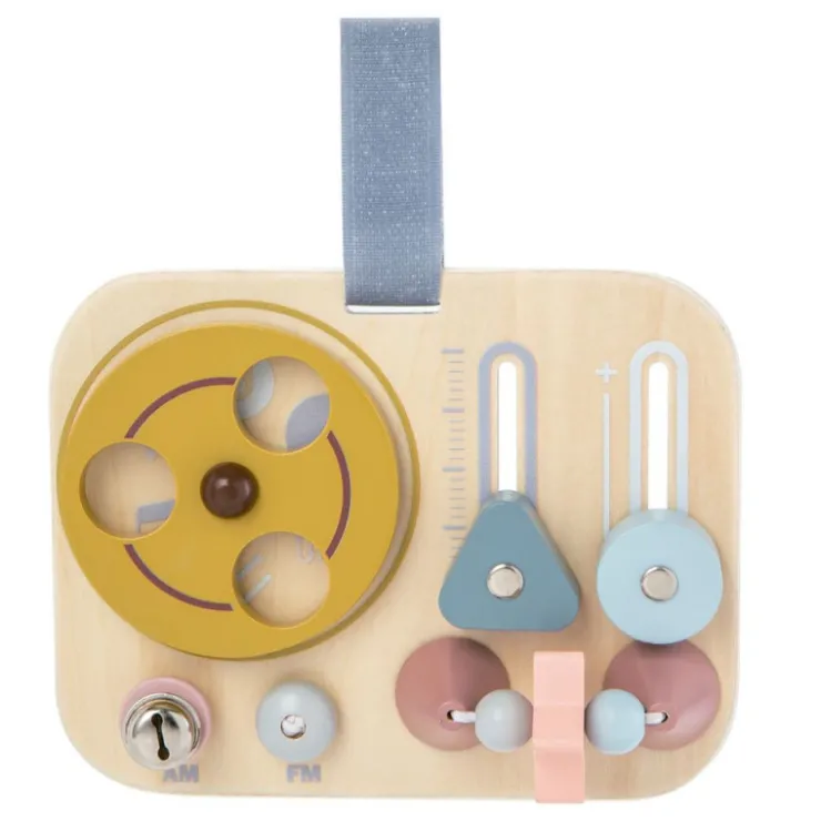 El plato giratorio se mueve suavemente, incluso con el dedo meñique, fomentando la destreza manual. La campana y la pequeña cuenta con cuerda elástica producen sonidos al impactar el tablero, estimulando el sentido auditivo. La estrella rosa gira, añadiendo movimiento y exploración táctil. Los bloques triangulares y circulares se mueven hacia arriba y hacia abajo desarrollando la comprensión de causa y efecto.
