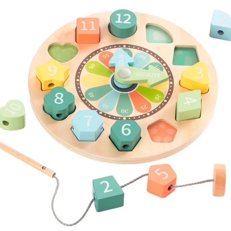 Sus manecillas son móviles y contiene 12 piezas con formas y numeración que encajan en sus ranuras correspondientes. Incluye también una cuerda para enhebrar las piezas y aprender los números.