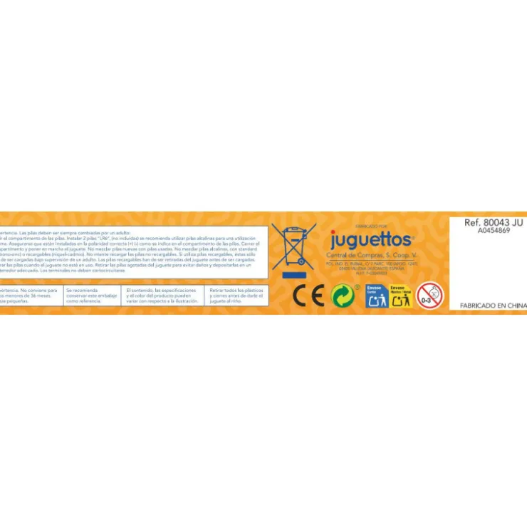 Las pilas deben ser siempre cambiadas por un adulto: abrir el compartimento de las pilas. Instalar 2 pilas LR6 (no incluidas) se recomienda utilizar pilas alcalinas para una utilización óptima. Asegurarse que están instaladas en la polaridad correcta + – como se indica en el compartimento de las pilas. Cerrar el compartimento y poner en marcha del juguete. No mezclar pilas nuevas con pilas usadas, No mezclar pilas alcalinas, con standard carbono-zinc o recargables níquel-cadmio. No intente recargar las pilas no recargables. Si utiliza pilas recargables, éstas sólo han de ser cargadas bajo supervisión de un adulto. Las pilas recargables han de ser retiradas del juguete antes de ser cargadas. Retirar las pilas cuando el juguete no esté en uso. Retirar las pilas agotadas del juguete para evitar daños y depositarlas en un contenedor adecuado. Los terminales no deben cortocircuitarse.