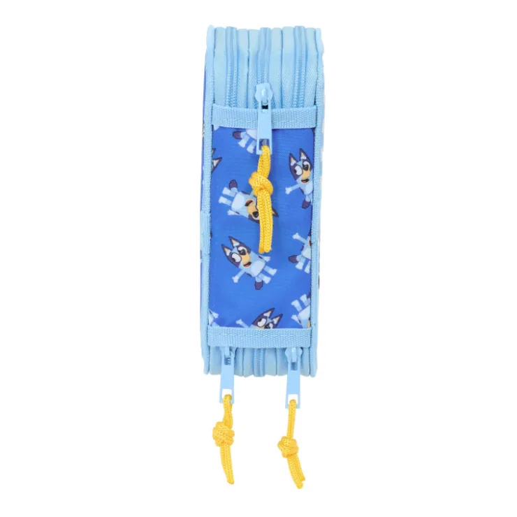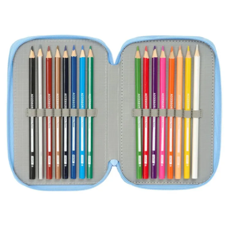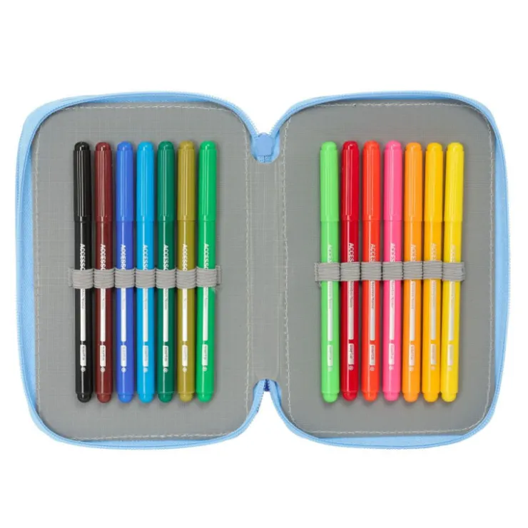 Contiene 37 piezas: goma, lápiz de grafito, bolígrafo azul-rojo, sacapuntas, regla azul grabada, y semicírculo (1er compartimento), 16 colorines de madera (2º compartimento). 14 rotuladores de colores (3º compartimento).