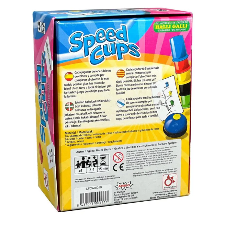En Speed Cups gana el que sea más rápido en colocar los cubiletes como muestra la carta y tocar el timbre.