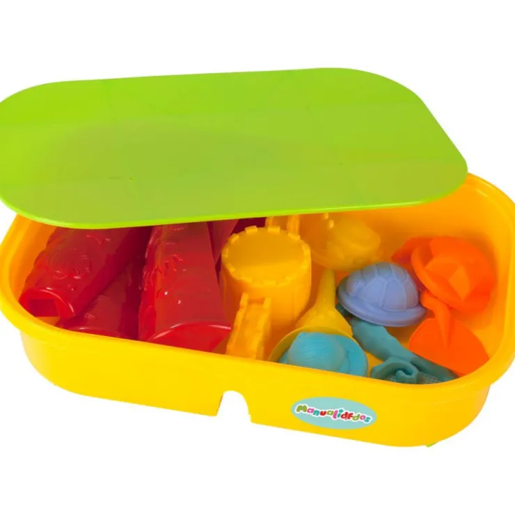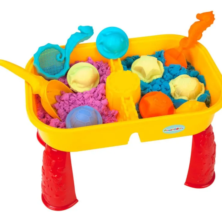 Con esta mesa arenero con 2 áreas de juego podrás crear todo lo que imagines. Incluye 4 moldes y herramientas para que tus creaciones sean mucho más divertidas. Cuando termines de jugar con la arena, guárdalo todo en su interior, pon la tapa y tu arenero se convertirá en mesa. Incluye 4 botes de 70 g arena de regalo con textura suave, fácil de modelar y nunca se seca.. 2 en 1 arenero y mesa.