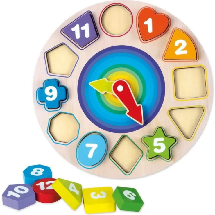 Un reloj de madera con el que tu bebé aprenderá a asociar conceptos y a diferenciar distintas formas encajando los números en su lugar correspondiente.