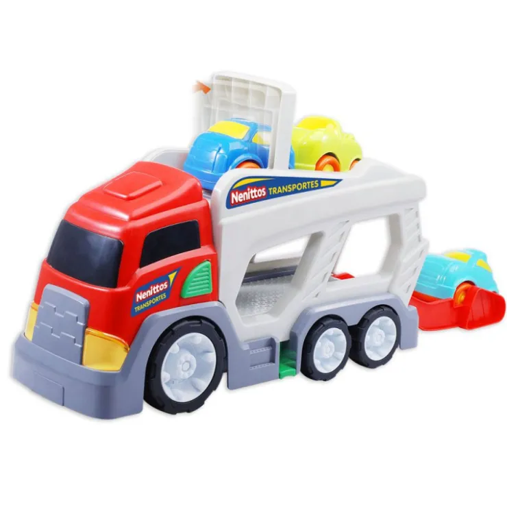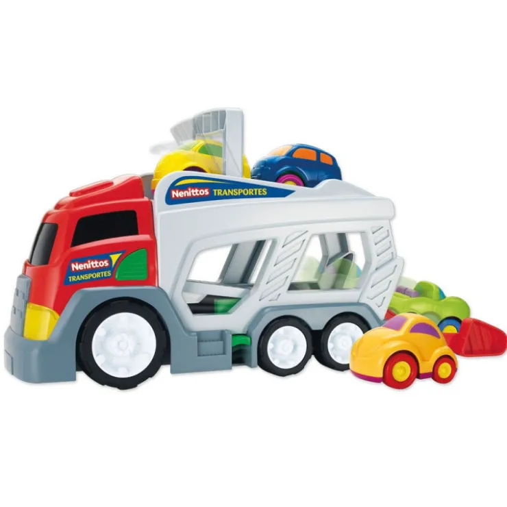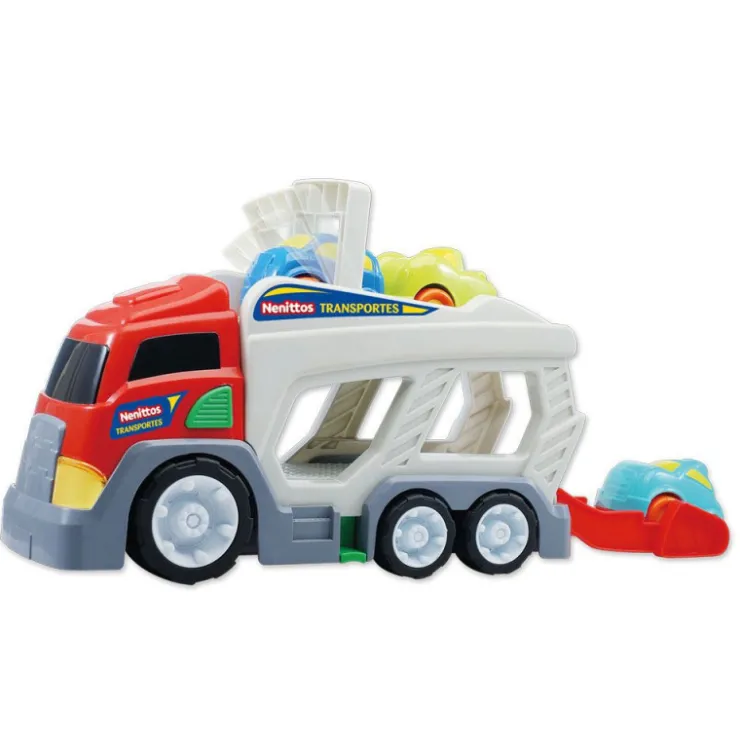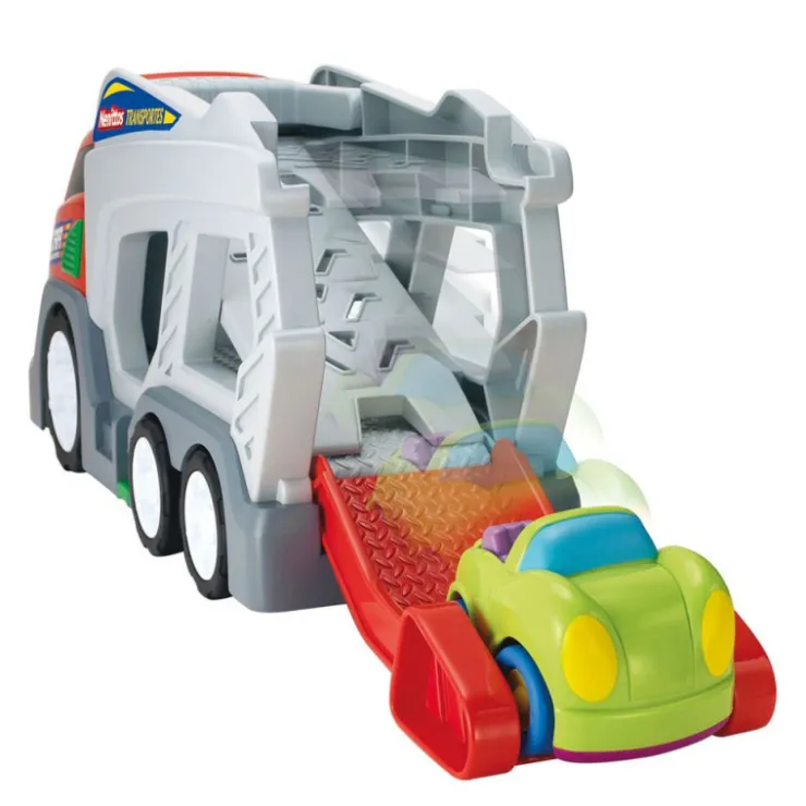 Imitando se ejercita la imaginación, se exterioriza la percepción de la realidad y se aprenden todo tipo de acciones. Un camión portacoches con un botón muy grande que cuando lo pulsas se activan luces intermitentes y puedes oír el claxon, el arranque del motor y una bonita melodía, además verás las luces de señalización. Tiene una plataforma para descargar los 4 coches que se incluyen.