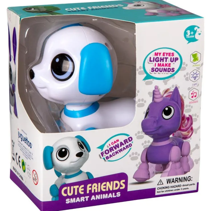 Puede avanzar hacia atrás, sus ojos se iluminan y hace sonidos divertidos.
