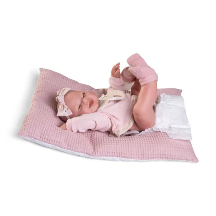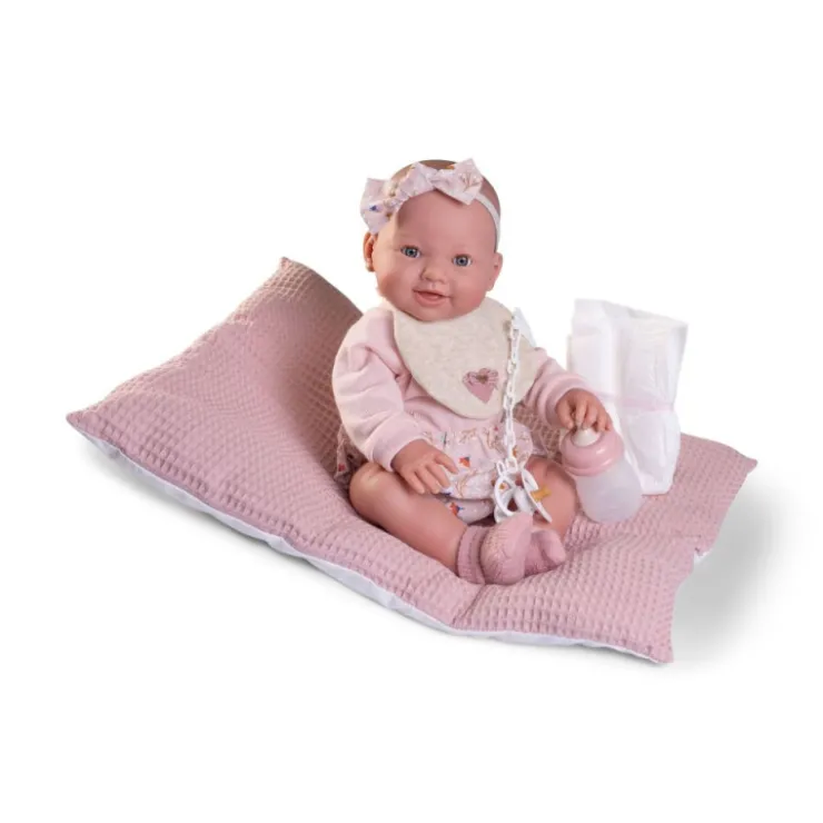 Incluye: diadema, camiseta, culotte, babero, calcetines, chupete con cadena, cojín, biberón y pañal.