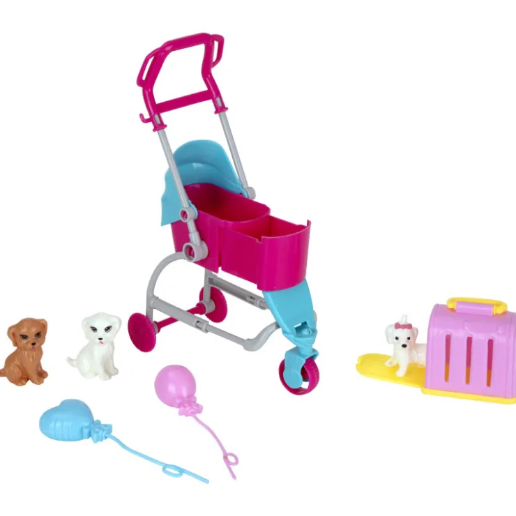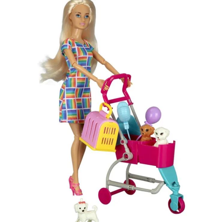 A Adabela le encanta salir a pasear con sus perritos. Tiene un carrito y transportín para poder ir con ellos a todas partes. Jugar con Adabela permite a niños y niñas a desarrollar su imaginación, expresar sus sentimientos, sus emociones y favorecer la reproducción de roles adultos al imitar situaciones diarias.