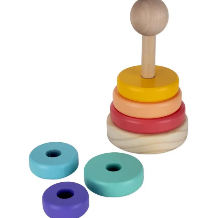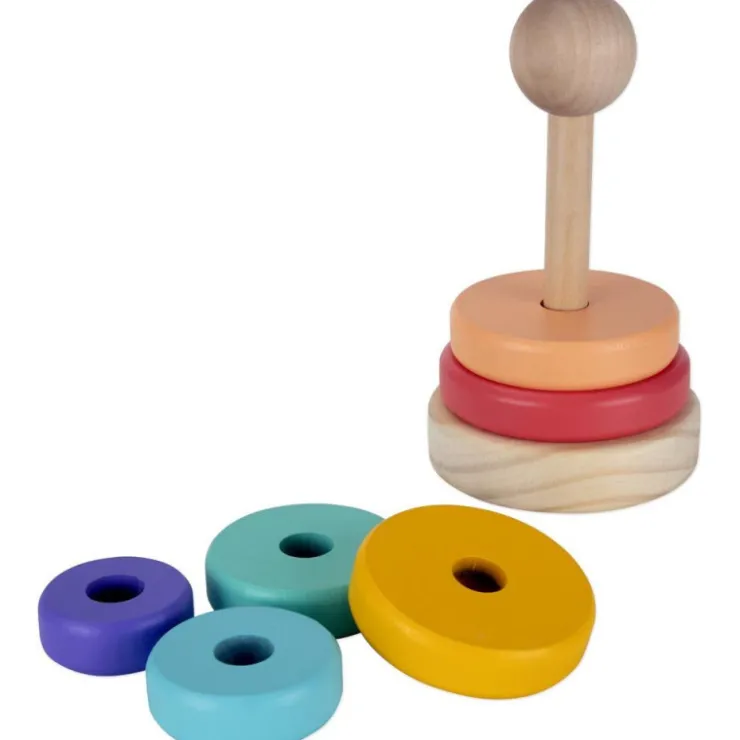 Pirámide apilable con 6 anillas de madera de diferentes tamaños y colores de gran resistencia. Ejercita la motricidad fina, fomentando el razonamiento y la diferenciación de tamaños y colores.