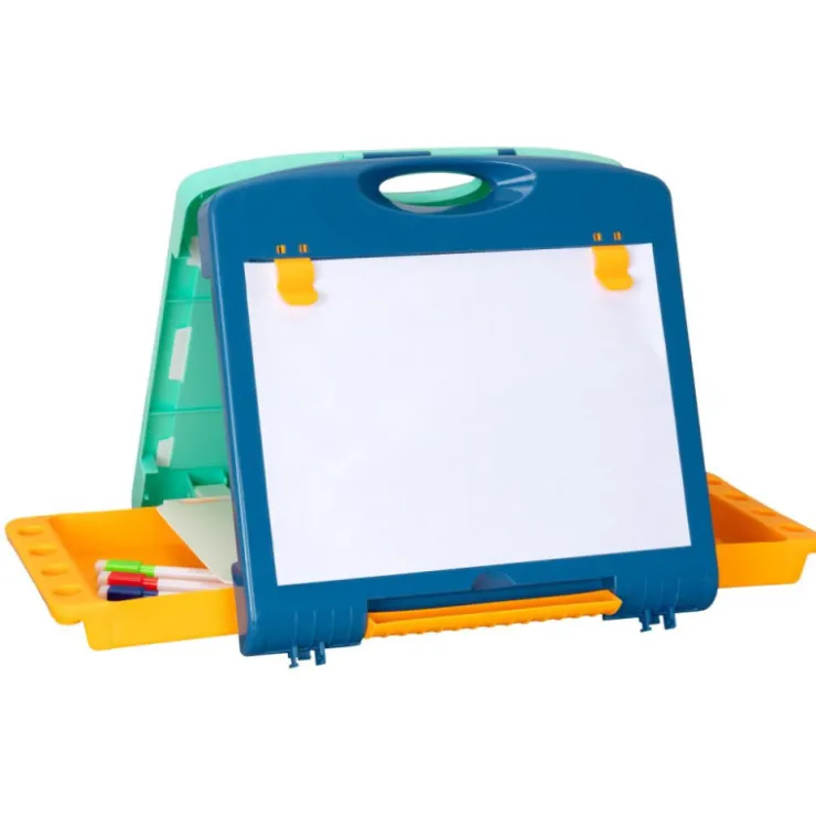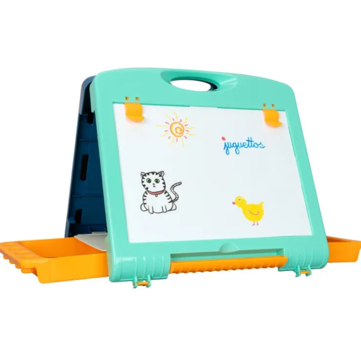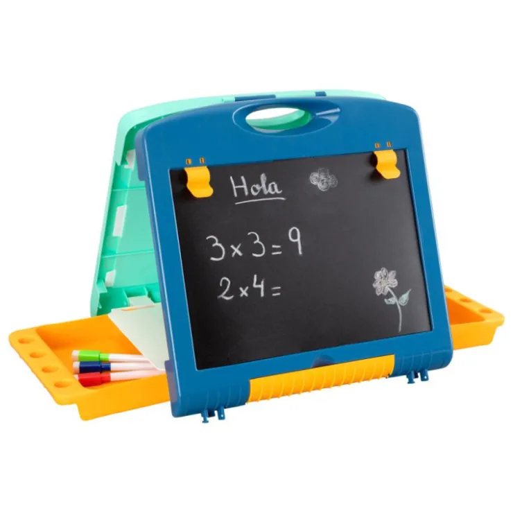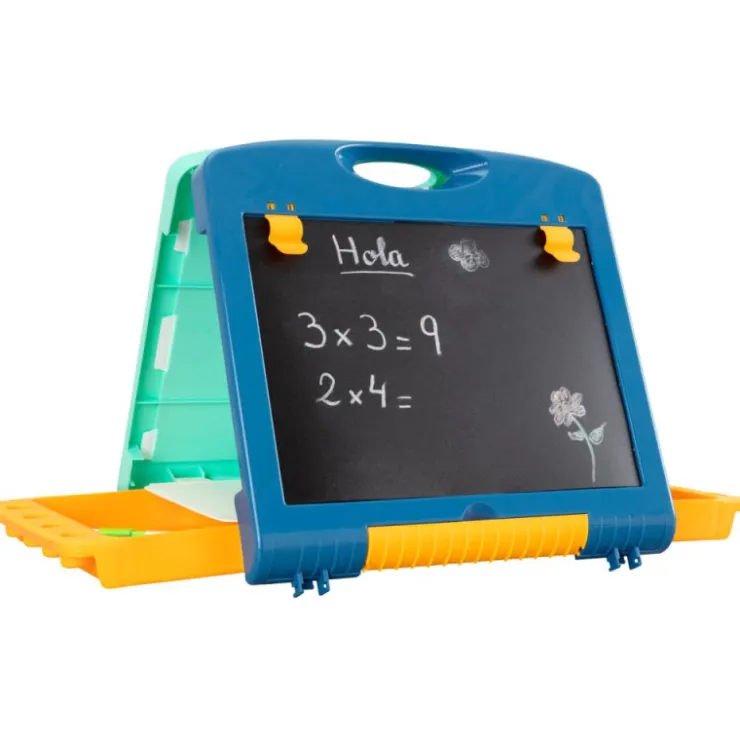 Maletín 2 en 1 plegable y portátil. Pizarra con doble superficie: una para tizas y otra para rotuladores borrables. Incluye compartimentos para organizar todos sus accesorios, pinzas para sujetar hojas y dos láminas de juego con sus piezas. Ideal para facilitar la iniciación a la escritura, estimular la creatividad y desarrollar el lenguaje.