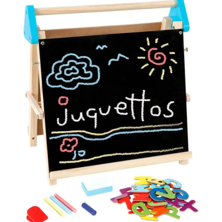 Colócala sobre una mesa y podrás empezar a dibujar. Tiene un lado donde podrás colocar las letras magnéticas y dibujar con el rotulador incluido y otro lado en el que podrás dar rienda suelta a tu imaginación utilizando las tizas. Además incluye un rollo de papel continuo y una pinza para sujetarlo, así tu pizarra se convertirá en caballete.