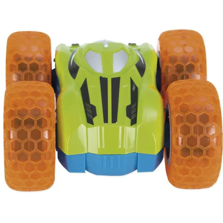Vehículo radiocontrol que gira 360º sobre si mismo y cambia de lado cuando choca con algún obstáculo. Además, los neumáticos son blandos. Un color por cada lado. Reversible. 2,4 GHz. Multidireccional.