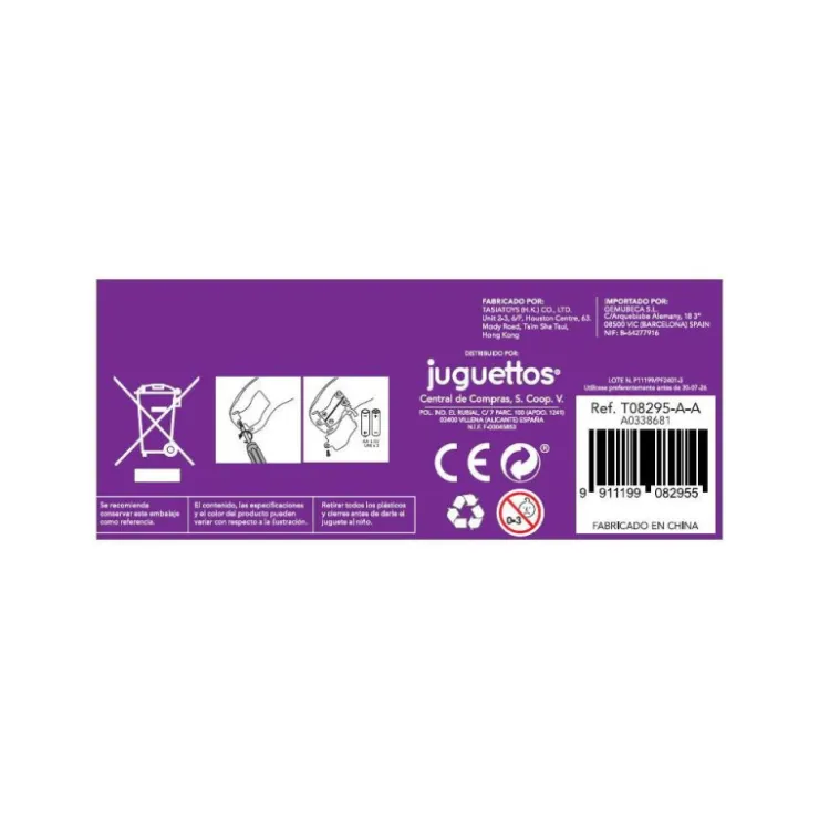 Las pilas deben ser siempre cambiadas por un adulto: abrir el compartimento de las pilas. Instalar 3 pilas LR6 (no incluidas). Se recomienda utilizar pilas alcalinas para una utilización óptima. Asegurarse que están instaladas en la polaridad correcta + – como se indica en el compartimento de las pilas. Cerrar el compartimento y poner en marcha del juguete. No mezclar pilas nuevas con pilas usadas, No mezclar pilas alcalinas, con standard carbono-zinc o recargables níquel-cadmio. No intente recargar las pilas no recargables. Si utiliza pilas recargables, éstas sólo han de ser cargadas bajo supervisión de un adulto. Las pilas recargables han de ser retiradas del juguete antes de ser cargadas. Retirar las pilas cuando el juguete no esté en uso. Retirar las pilas agotadas del juguete para evitar daños y depositarlas en un contenedor adecuado. Los terminales no deben cortocircuitarse.