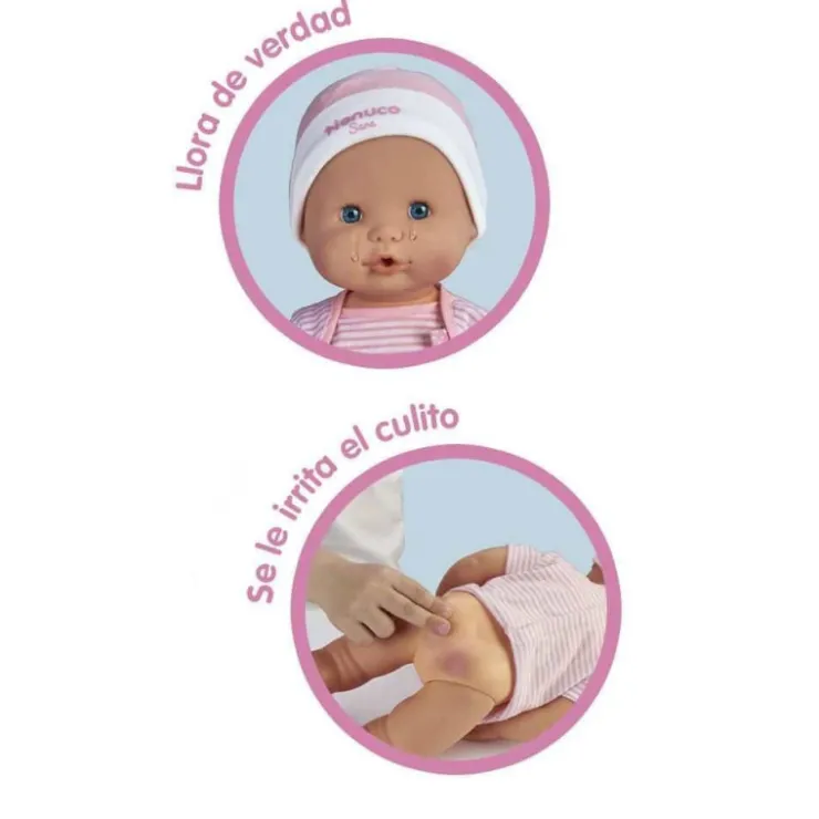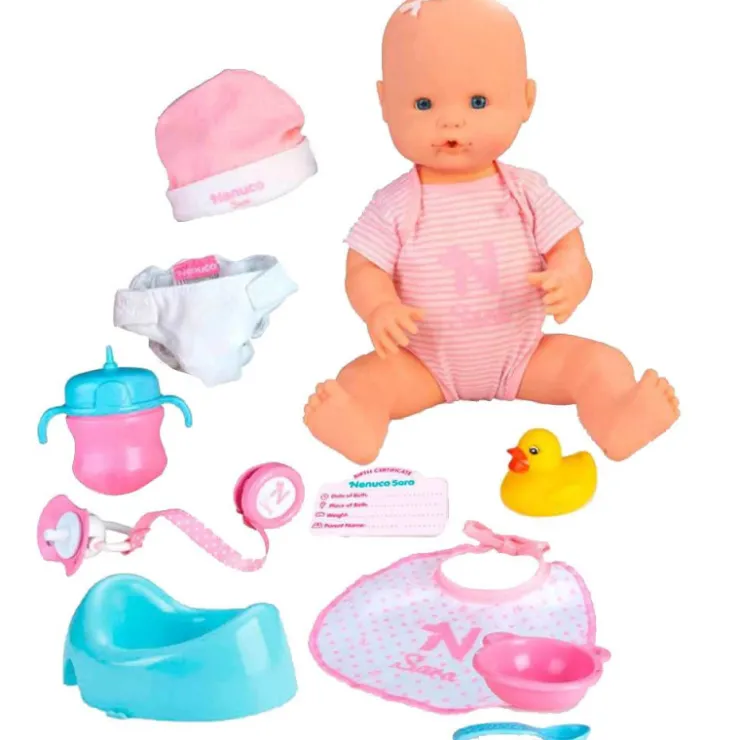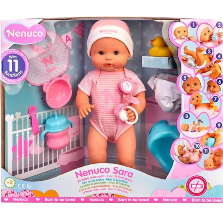 Además viene con 9 accesorios para cuidar de ella de la forma más completa. Viste un pijamita rosa muy suave con su nombre, se puede vestir y desvestir . También se puede jugar en la bañera.
