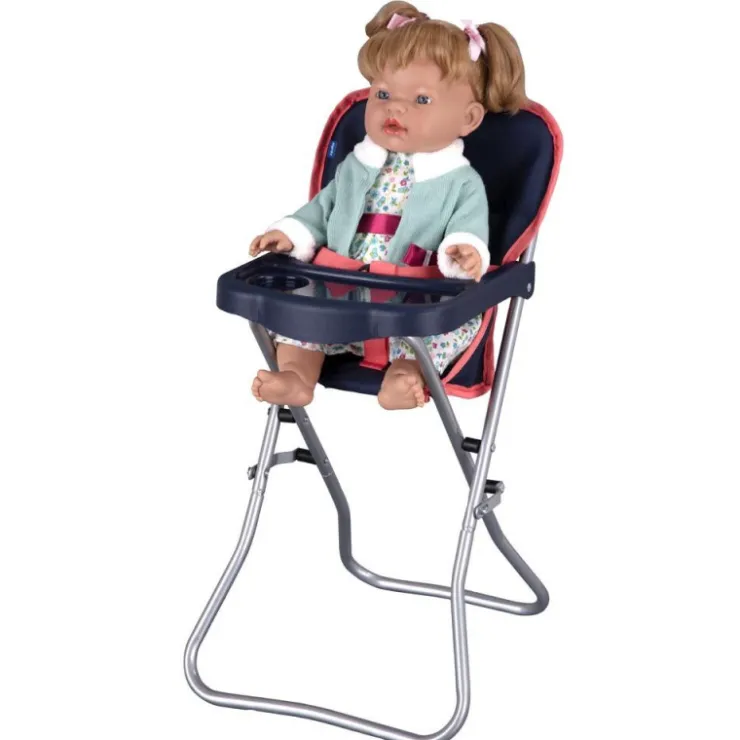Sienta a tu bebé Mimittos en la trona para darle de comer. Tiene una bandeja donde podrás dejar su vaso y su plato. Plegable. Para muñecos de 38-43 cm.