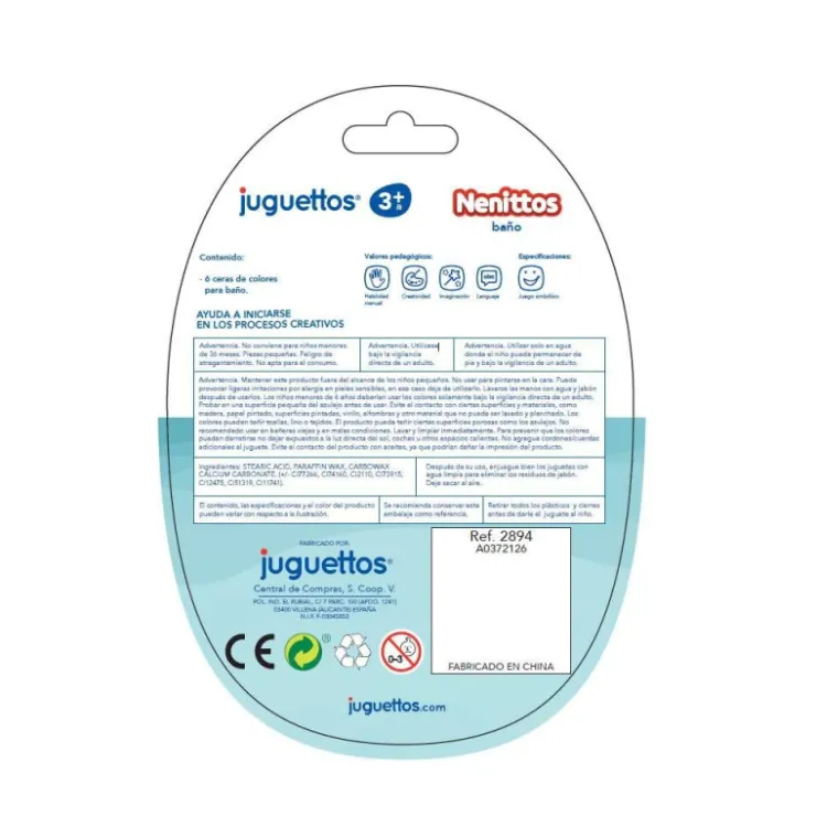 Probar en una superficie pequeña del azulejo antes de usar. Evite el contacto con ciertas superficies y materiales, como madera, papel pintado, superficies pintadas, vinilo, alfombras y otro material que no pueda ser lavado y planchado. Los colores pueden teñir toallas, lino o tejidos. El producto puede teñir ciertas superficies porosas como los azulejos. No recomendado usar en bañeras viejas y en malas condiciones. Lavar y limpiar inmediatamente. Para prevenir que los colores puedan derretirse no dejar expuestos a la luz directa del sol, coches u otros espacios calientes. No agregue cordones/cuerdas adicionales al juguete. Evite el contacto del producto con aceites, ya que podrían dañar la impresión del producto.
