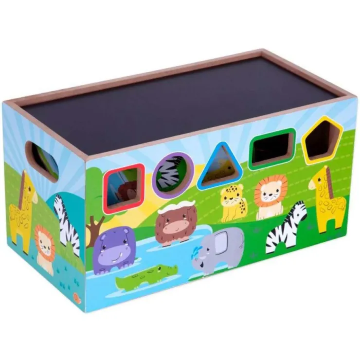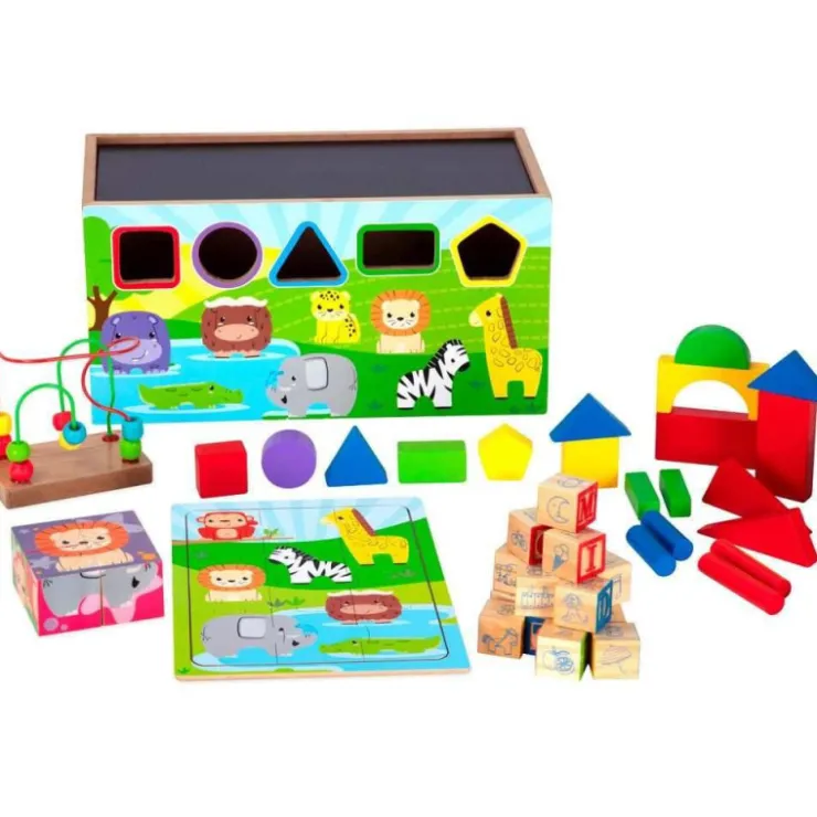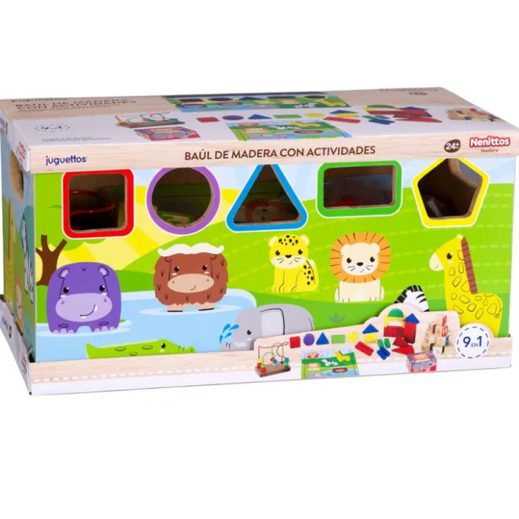 Un baúl de madera con el que niños y niñas aprenderán a asociar conceptos y a diferenciar distintas formas. ¡Diviértete construyendo castillos y puzzles, además podrás pintar en la pizarra doble y aprender formas!