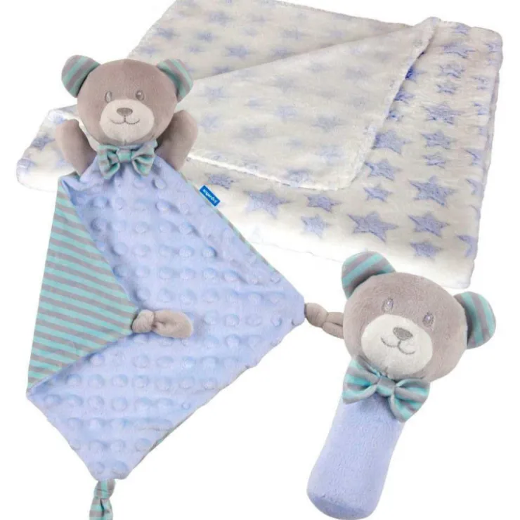 Con este set de paseo tu bebé se mantendrá tranquilo y calentito durante las salidas o en su cuna. Incluye un dou dou osito que podrá abrazar para sentirse acompañado y que le resulte más fácil dormir, un sonajero blandito que también podrá abrazar y una manta muy agradable para arroparle.