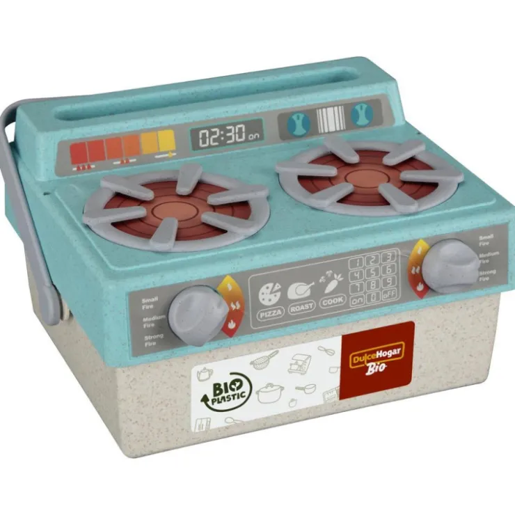 Cocina portátil tipo hornillo con asa y mandos giratorios, que incluye accesorios de menaje de cocina, platos y cubiertos en su interior. Fabricado en plástico proveniente de fibra de trigo. Permite recogerlo todo dentro y llevarla a cualquier sitio. Desarrolla la imaginación creando historias de la vida diaria, favoreciendo la expresión verbal.