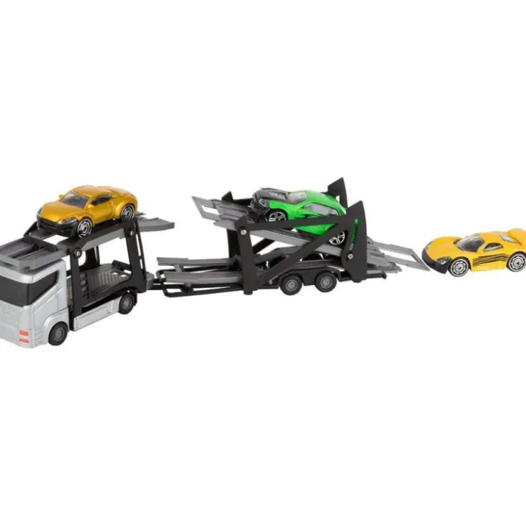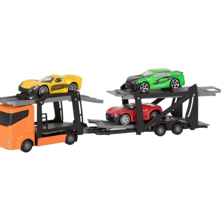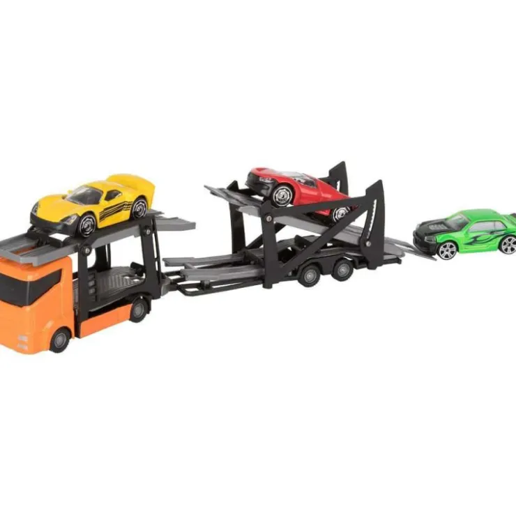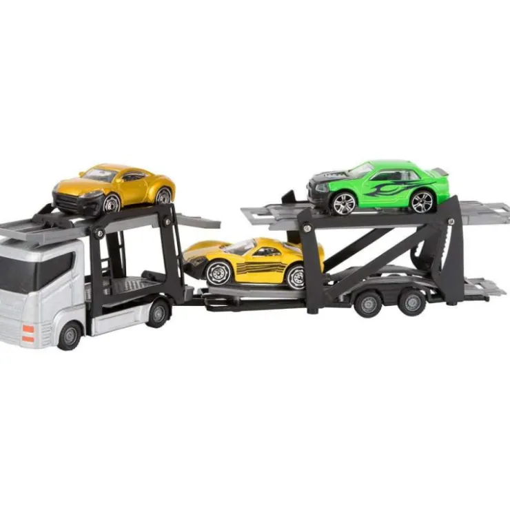 Con este camión podrás transportar los coches a cualquier parte. Cuando llegues a tu destino baja la rampa y podrás descargarlos fácilmente. Vehículos de metal. Rueda libre.