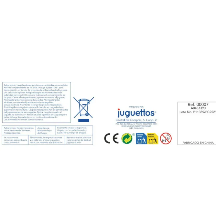 Las pilas deben ser siempre cambiadas por un adulto: abrir el compartimento de las pilas. Incluye 3 pilas LR6 para demostración en tienda. Se recomienda utilizar pilas alcalinas para una utilización óptima. Asegurarse que están instaladas en la polaridad correcta + – como se indica en el compartimento de las pilas. Cerrar el compartimento y poner en marcha del juguete. No mezclar pilas nuevas con pilas usadas, No mezclar pilas alcalinas, con standard carbono-zinc o recargables níquel-cadmio. No intente recargar las pilas no recargables. Si utiliza pilas recargables, éstas sólo han de ser cargadas bajo supervisión de un adulto. Las pilas recargables han de ser retiradas del juguete antes de ser cargadas. Retirar las pilas cuando el juguete no esté en uso. Retirar las pilas agotadas del juguete para evitar daños y depositarlas en un contenedor adecuado. Los terminales no deben cortocircuitarse.