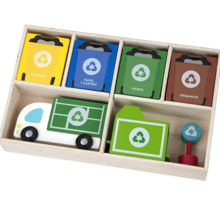 Imitando se ejercita la imaginación, se exterioriza la percepción de la realidad y se aprenden todo tipo de acciones. Con este centro de reciclaje de madera, niños y niñas aprenderán a clasificar la basura en los diferentes contenedores.