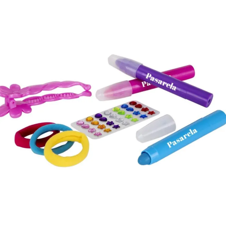 Set de accesorios para decorar el pelo, con 3 tizas de colores diferentes para hacer mechas, coleteros y abalorios brillantes. Potencia el gusto estético, la creatividad y el juego compartido.