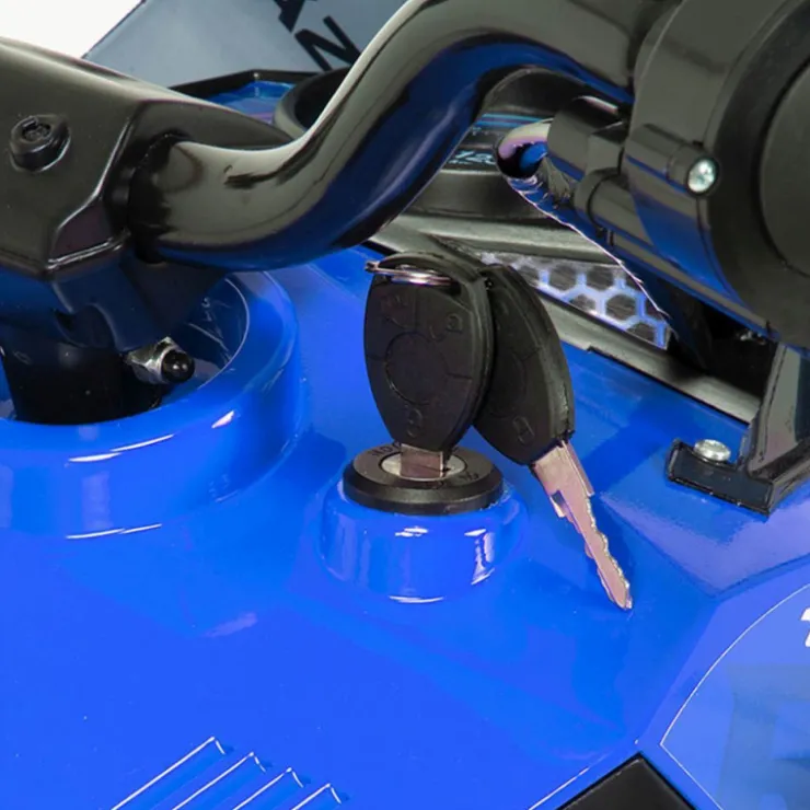 Gracias a su batería de 12V, este quad alcanza una velocidad punta de 5-6 km/h y dispone de cambio de marchas, para poder circular marcha atrás. Su gran estabilidad y comodidad se consigue gracias a las suspensiones delanteras y traseras y a las ruedas anchas de plástico con bandas de goma.