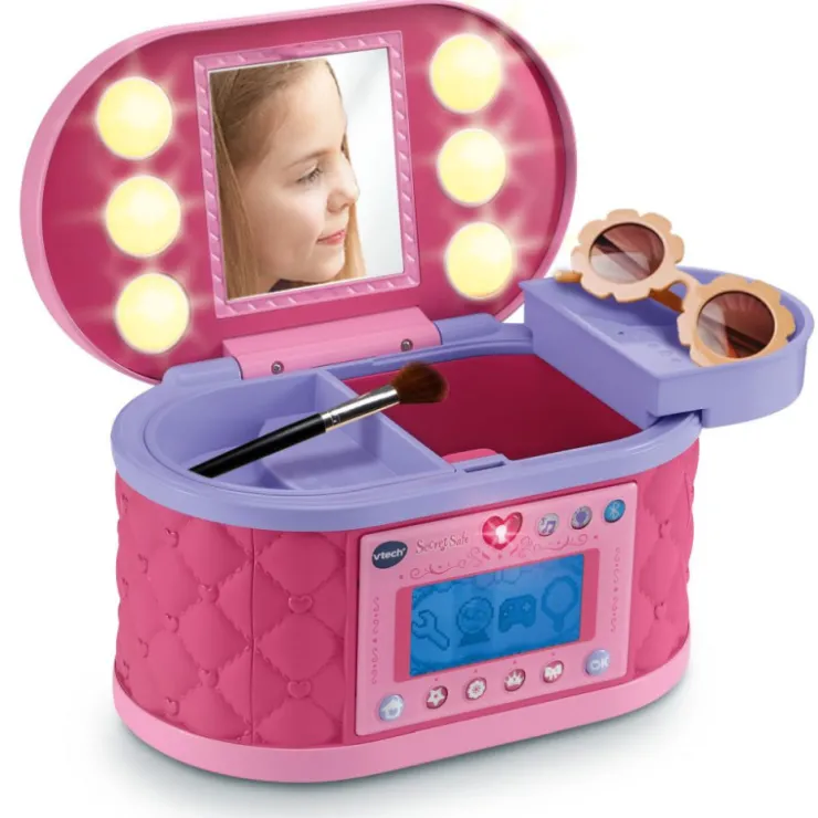 Un tesoro portátil donde guardar secretos y desatar la creatividad: al teclear su código personal, la tapa se abre y los LED de colores iluminan el espejo, invitando a probar accesorios o maquillaje y reforzando la autonomía. La pantalla LCD muestra hora y alarma para aprender a organizar el tiempo, revela el código si lo olvidas y propone animaciones y minijuegos de moda y maquillaje que enseñan números y ortografía sin darse cuenta. Tres compartimentos uno grande y dos bandejas ayudan a clasificar joyas y recuerdos, fomentando el orden. Conecta el móvil por Bluetooth o sintoniza la radio para escuchar música mientras diseñas tu avatar y cambias sus looks, desarrollando la imaginación y el sentido estético. Asa integrada para llevarlo a todas partes y botones de personalización que convierten cada sesión en una pasarela de diversión segura y privada.
