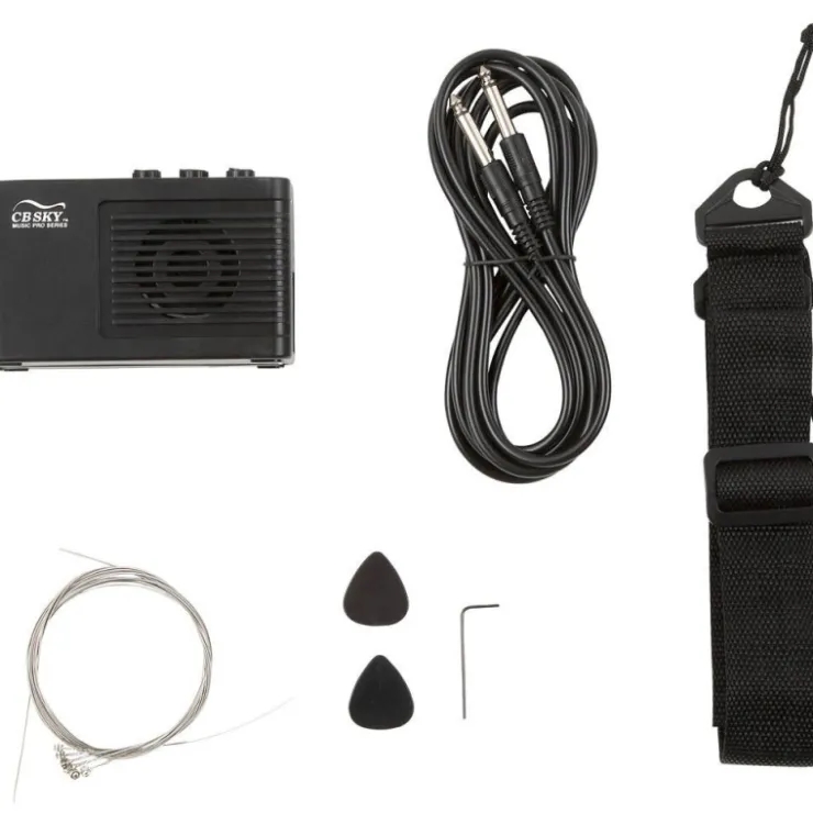 Con amplificador, correa, juego de cuerdas de repuesto, cable jack y 2 púas.