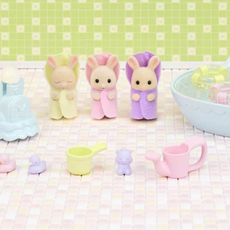 En el set Hora del Baño de los Trillizos encuentras todos los imprescindibles para llenar de diversión este momento: bañera con orejitas de conejo en honor a los recién llegados flotadores para jugar sin miedo regadera para ver si crece tu hermanito jabón con forma de osito cubito y 3 patitos que acompañan a los trillizos en todos sus baños. ¡Cada uno tiene el suyo y van a juego!