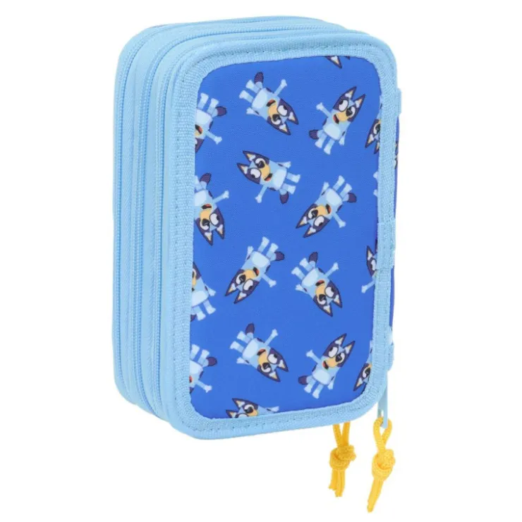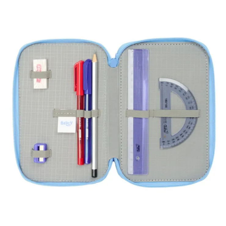 Contiene 37 piezas: goma, lápiz de grafito, bolígrafo azul-rojo, sacapuntas, regla azul grabada, y semicírculo (1er compartimento), 16 colorines de madera (2º compartimento). 14 rotuladores de colores (3º compartimento).