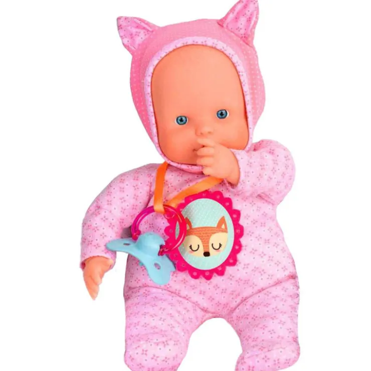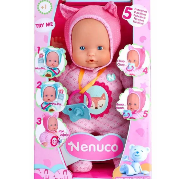 Si aprietas sus manos dirá pa-pa y ma-ma, y al apretarle la barriga se reirá. Además, si le das el chupete hará sonidos de succión, pero si se lo quitas se pondrá a llorar. También puede meterse el dedo en la boca como los bebés de verdad.
