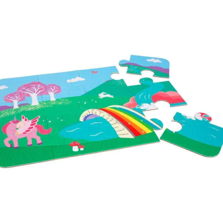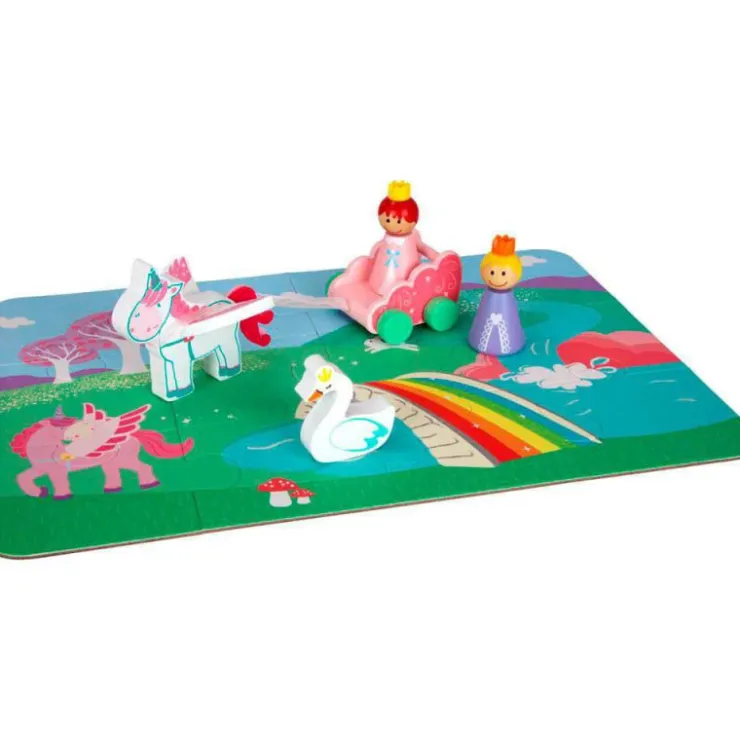 Un puzzle con el que niños y niñas aprenderán a asociar conceptos y a diferenciar distintas formas. Cuando terminen de montar el puzzle tendrán un escenario para jugar con los personajes de madera incluidos.
