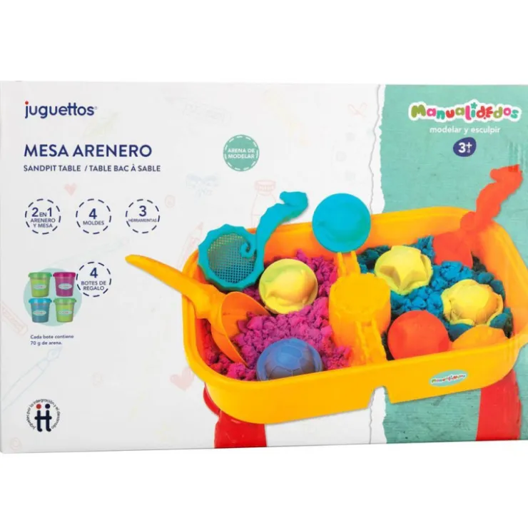Con esta mesa arenero con 2 áreas de juego podrás crear todo lo que imagines. Incluye 4 moldes y herramientas para que tus creaciones sean mucho más divertidas. Cuando termines de jugar con la arena, guárdalo todo en su interior, pon la tapa y tu arenero se convertirá en mesa. Incluye 4 botes de 70 g arena de regalo con textura suave, fácil de modelar y nunca se seca.. 2 en 1 arenero y mesa.