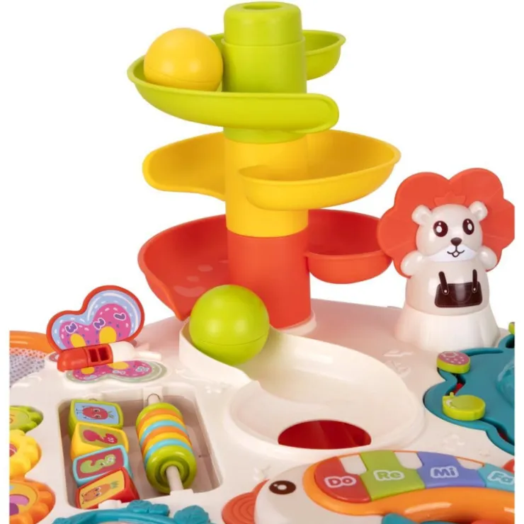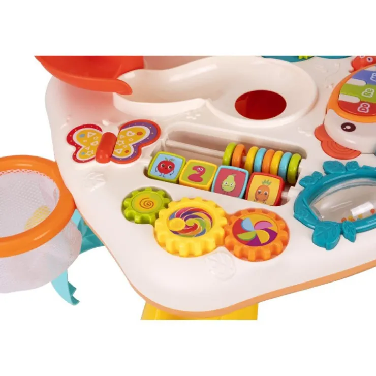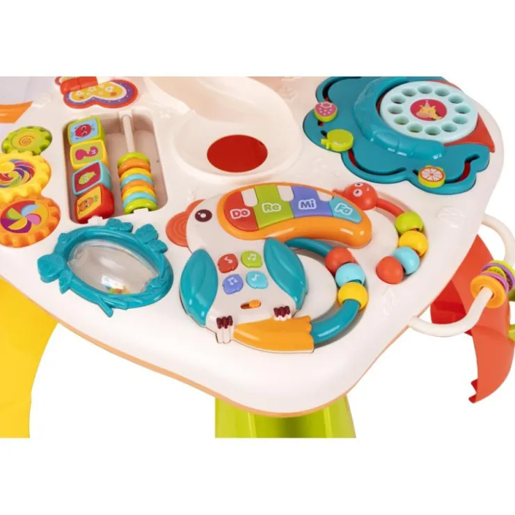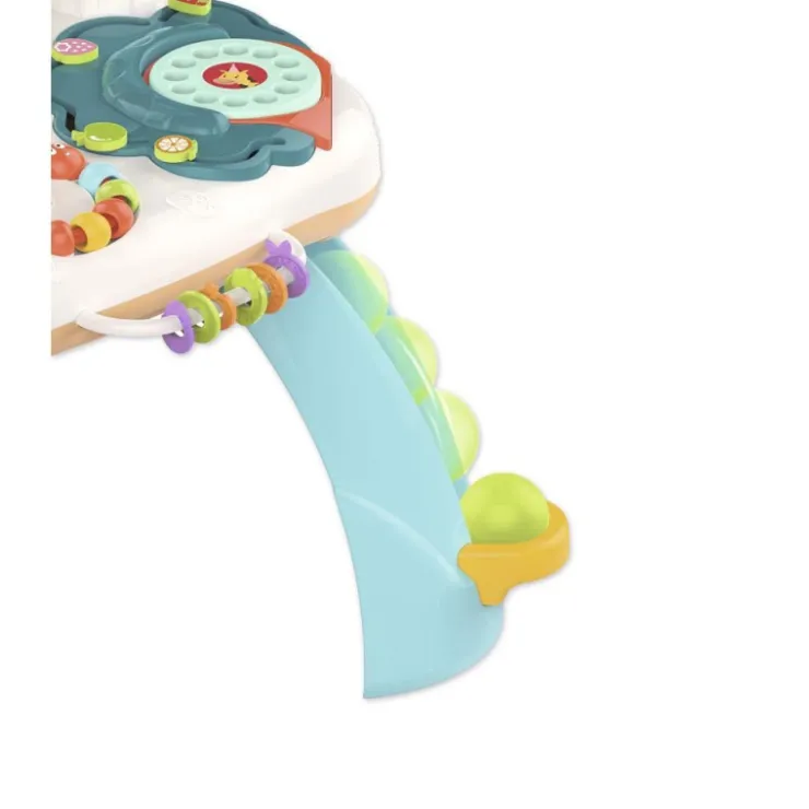 Mesa de actividades con la que tu bebé ejercitará la coordinación ojo-mano además de segmentar los movimientos de los dedos al pulsar el teclado, girando los engranajes o dejando caer las bolas por los agujeros.