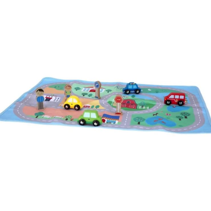 Tapiz de tela para el suelo que representa una ciudad con calles y algunos lugares destacados como el parque, ayuntamiento y hospital. Desarrolla la imaginación y favorece el juego compartido, así como el conocimiento de las señales básicas de tráfico y primeras normas de circulación.