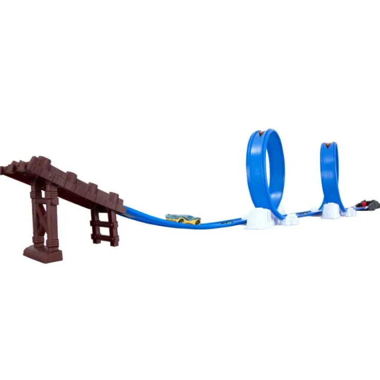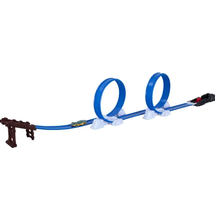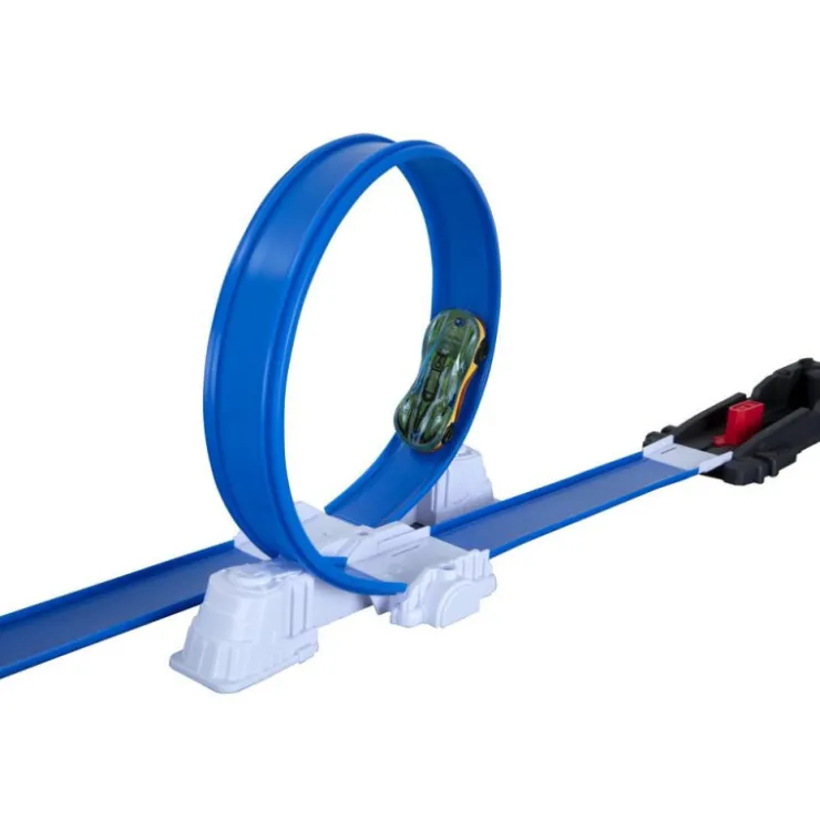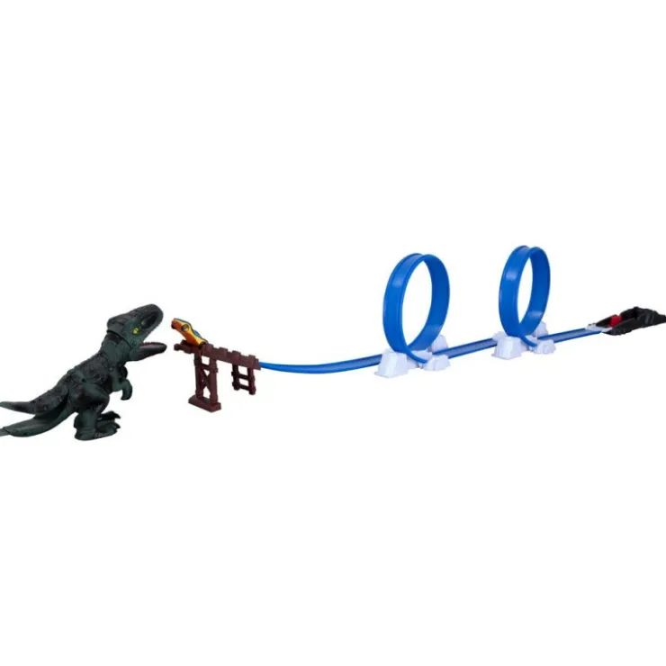 Trepidante pista con giros espectaculares de 360º. Activa la lanzadera y el coche alcanzará velocidades de vértigo pasando por los 2 loopings y saliendo por la cola del dinosaurio. Rueda libre. Recorrido 2,15 m.
