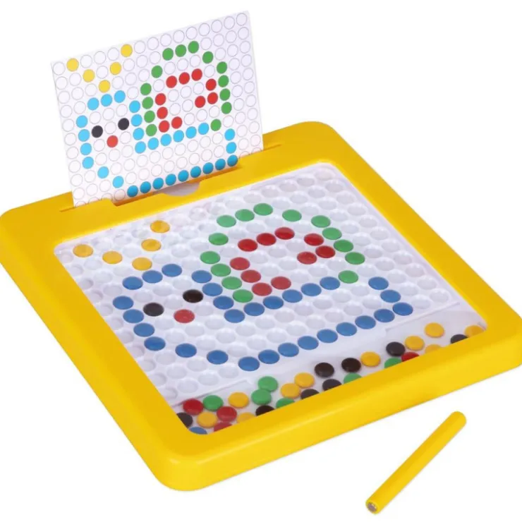 Pizarra magnética de fichas de colores con la que niños y niñas podrán desarrollar sus habilidades manipulativas precisas colocando cada ficha sobre el hueco correspondiente, creando textos o dibujos de forma libre o siguiendo las plantillas. Favorece la discriminación de colores, desarrolla la organización espacial y potencia la paciencia.