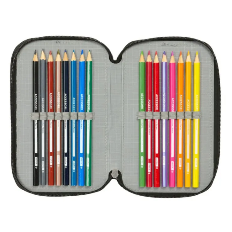 Contiene 37 piezas : goma, lápiz de grafito, bolígrafo azul-rojo, sacapuntas, regla azul grabada, y semicírculo (1er compartimento), 16 colorines de madera (2º compartimento). 14 rotuladores de colores (3º compartimento).