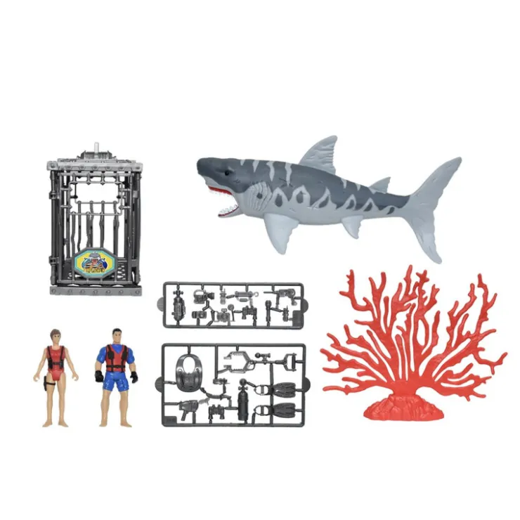 Con figuras articuladas. Tira de la aleta del tiburón para activar la luz y el sonido.