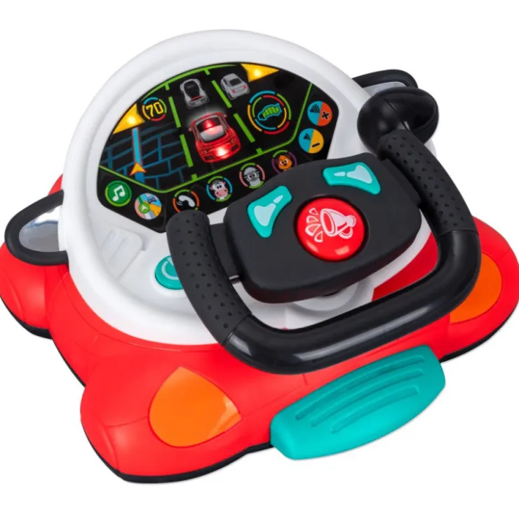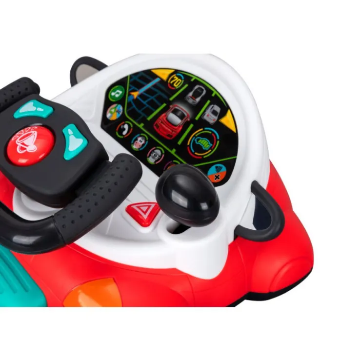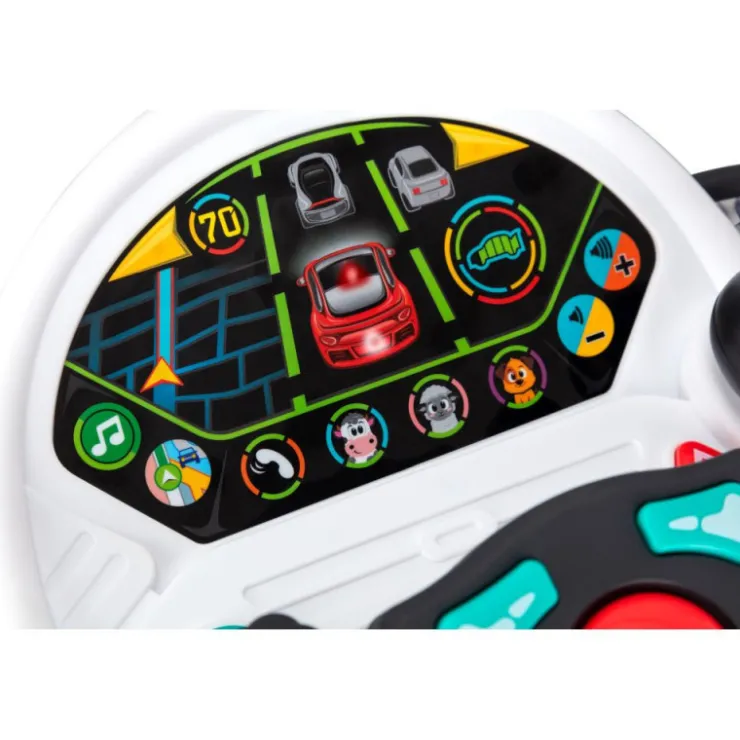 Un divertido volante con intermitentes, palanca de cambios, botón de arranque y claxon. Incluye un panel táctil con mútiples sonidos, luces, melodías, tono de llamada y GPS. Además, dispone de control de volumen.